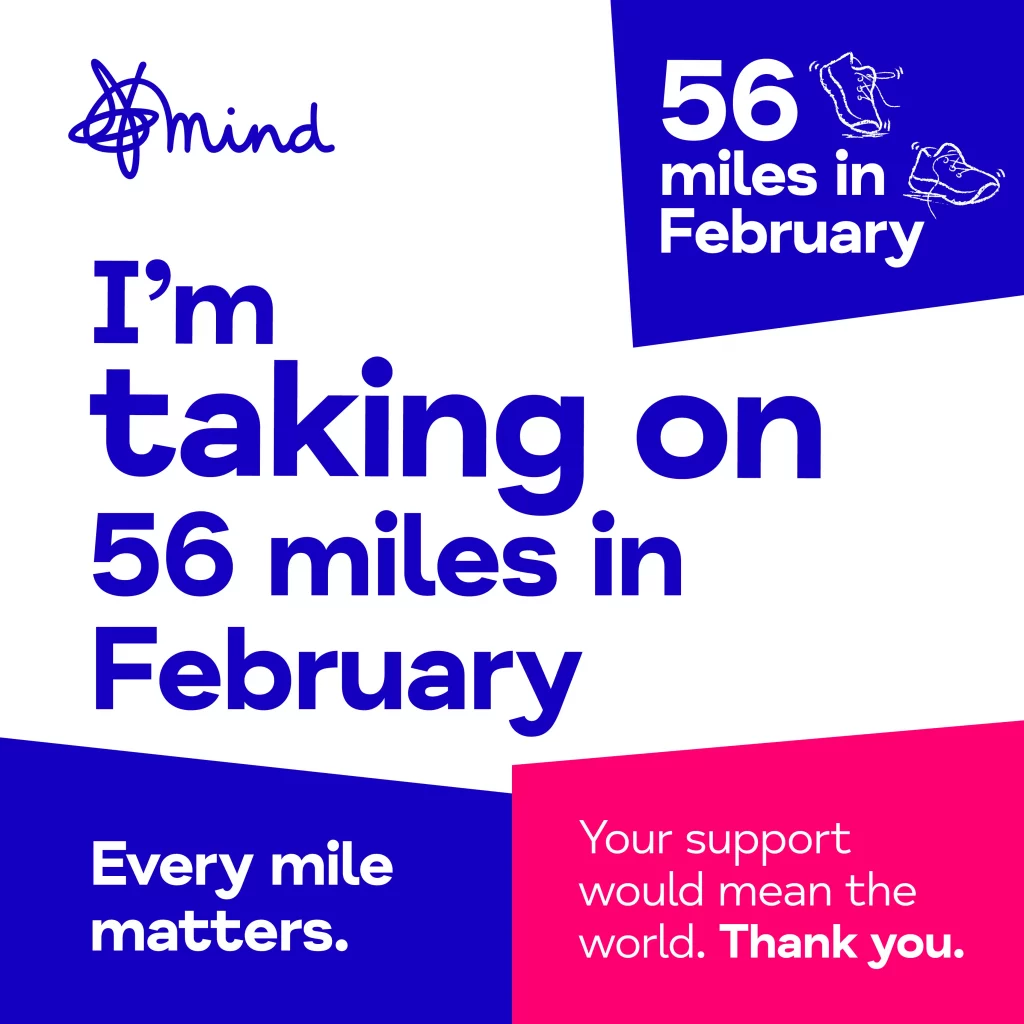 As a supporter of help for those suffering with mental health issues, Steve is participating in Mind’s challenge, 56 miles in February.